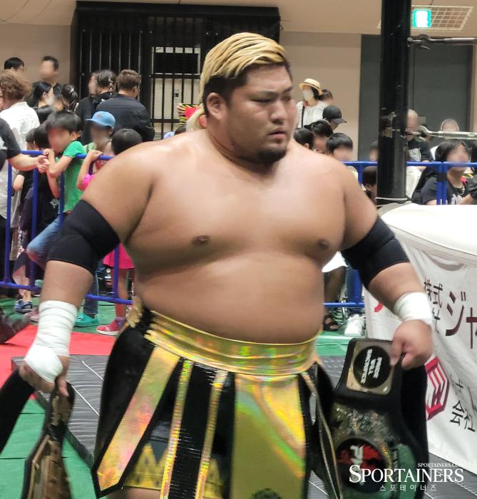 | 23일 일본 사가현 도스시민체육관에서 열린 규슈 프로레슬링(Q-PRO) 대회에 출전한 규슈 프로레슬링 챔피언 노자키 코다이. 동시에 한국의 PWS 챔피언이기도 한 그는 항상 일본 현지 대회에서도 PWS 벨트를 들고 등장한다. (사진: 고초록 기자) |