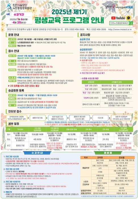 • 인천시설공단 인천노인종합문화회관, 2025년 제1기 평생교육 프로그램 수강생 모집