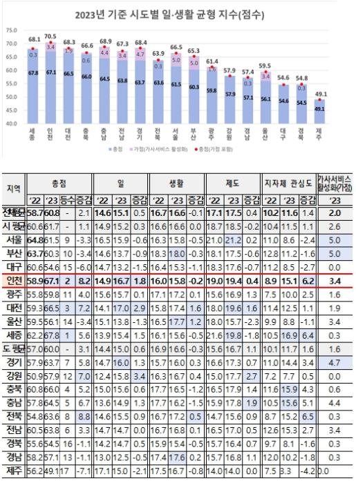 2024년 인천시의 가족친화인증 기업은 전년 대비 67% 증가한 61개 사로 늘어나며, 고용노동부가 발표한 일·생활균형지수에서도 전국 2위(가점 시 전국 1위)를 기록하는 등 가족친화적인 근로 환경 조성에 있어 성과를 보이고 있다.
