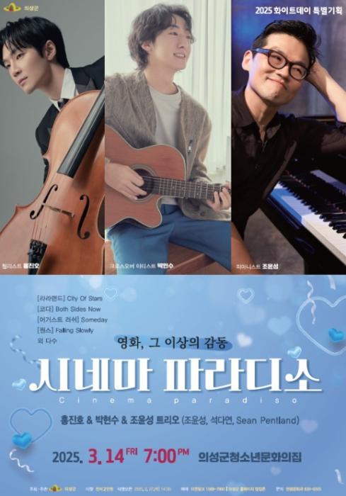 의성군은 첼리스트 홍진호, 크로스오버 아티스트 박현수, 피아니스트 조윤성트리오(조윤성, 석다연, Sean Pentland)가 함께 꾸미는 화이트데이 특별 기획공연 '시네마 파라디소'를 오는 3월 14일 저녁 7시, 의성군청소년문화의집에서 개최한다고 밝혔다.